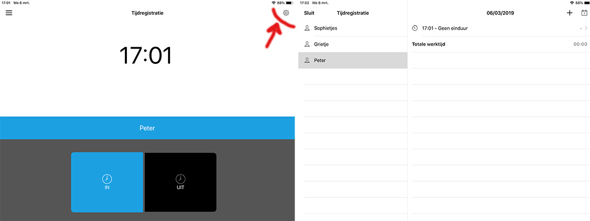- in de module tijdregistratie ga je rechtsboven een tanwiel zien , klik op dit tandwiel