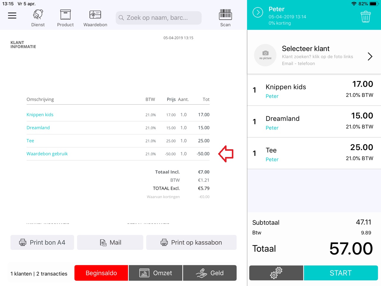Nu zie je dat de waardebon invers wordt aangeboden omdat we deze in mindering moeten brengen op de kassabon.