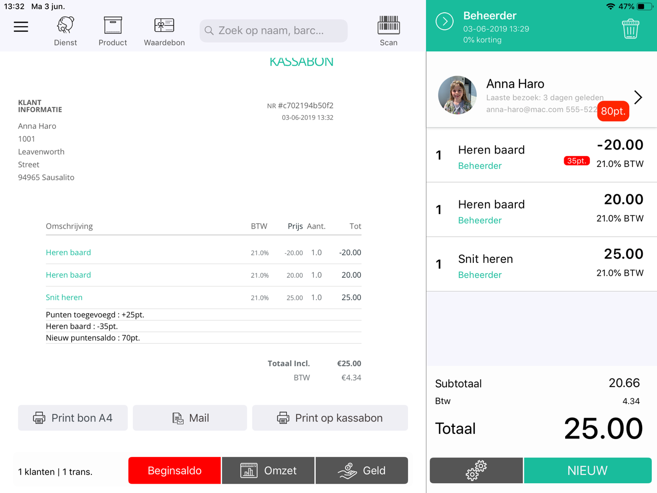Nu krijg je in de kassa de puntenbehandeling "Heren baard" en is de prijs invers. (zodat de normale heren behandeling + puntenbehandeling = 0 EUR uitkomt) en zie je hoeveel punten er genomen zullen worden.