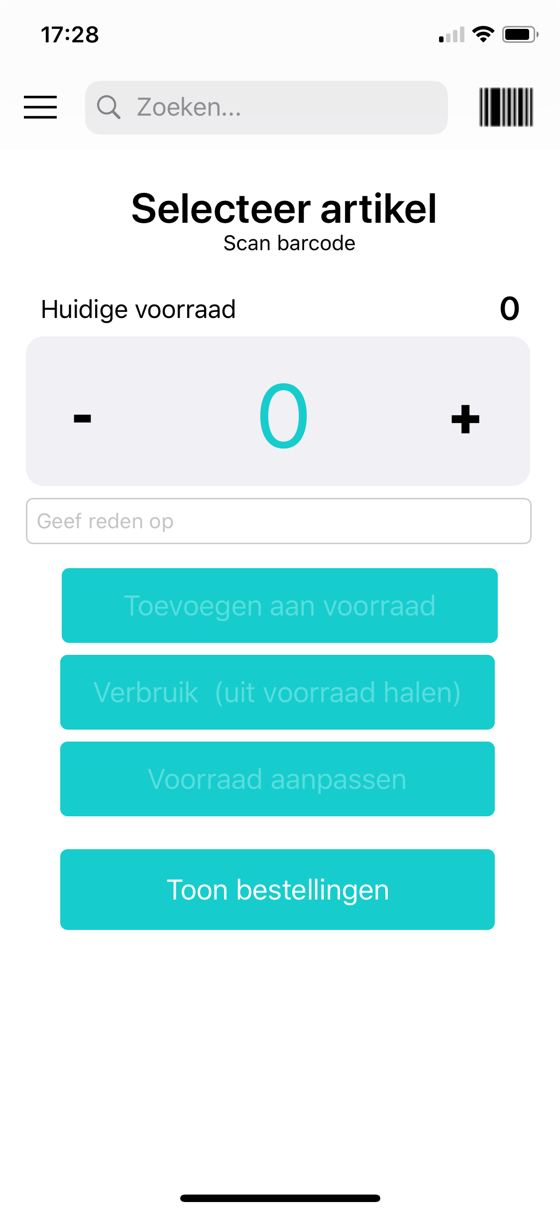 - Product opzoeken (via zoeken) of inscannen aan de hand van de barcode (rechts)