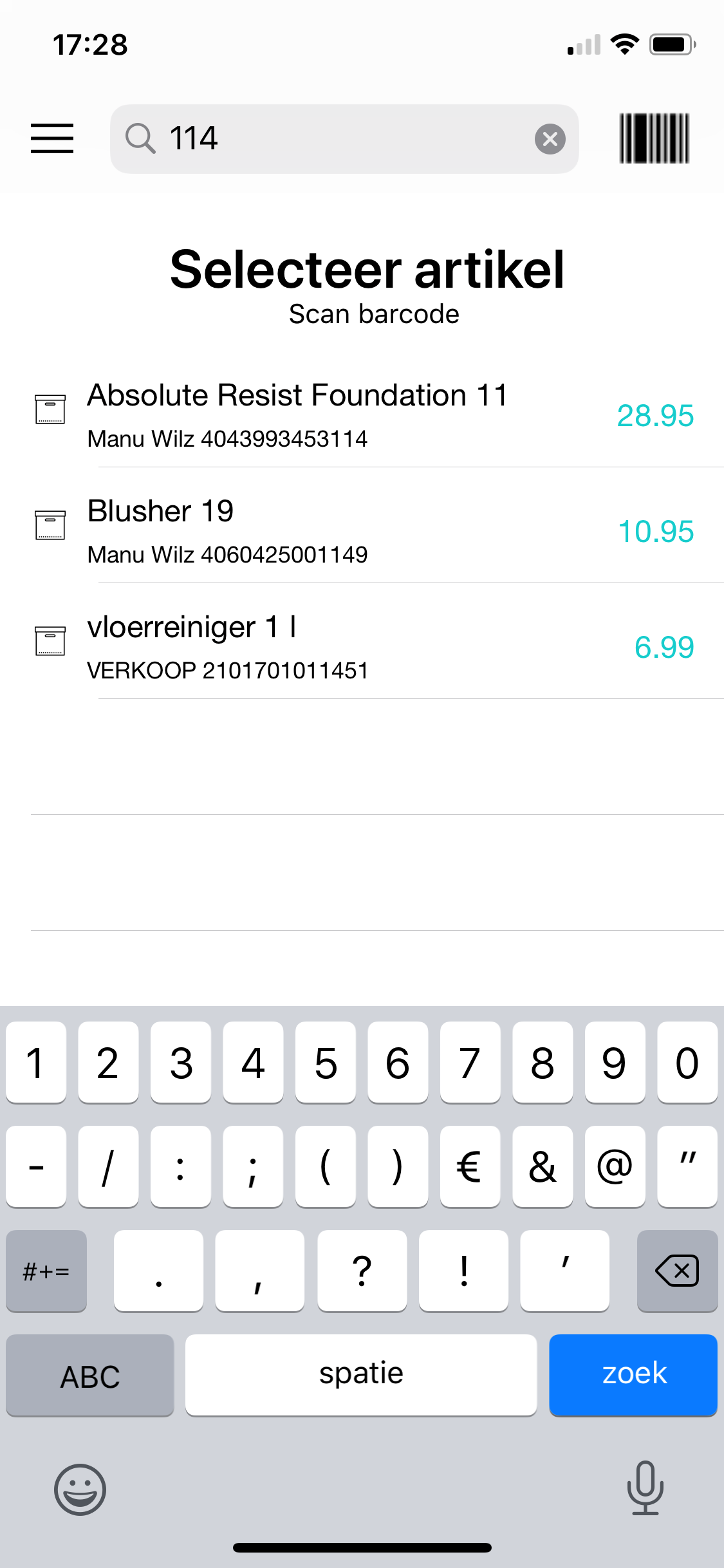 Opmerking : als je op barcode gaat zoeken dan moet de barcode gekend zijn in het systeem. In Instellingen > Producten > kan je per product een barcode toekennen.