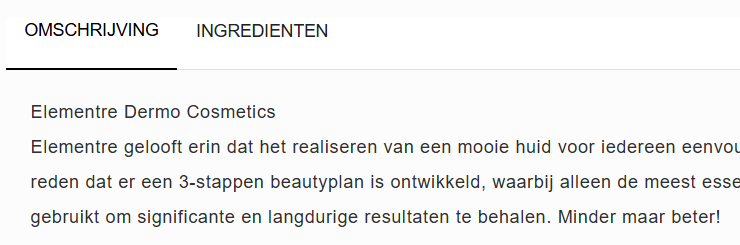 Indien je in de product omschrijving de tag "(ing)" voorziet dan al alle tekst onder deze tag op de webshop getoond worden in een nieuw tabblad nl "Ingredienten".