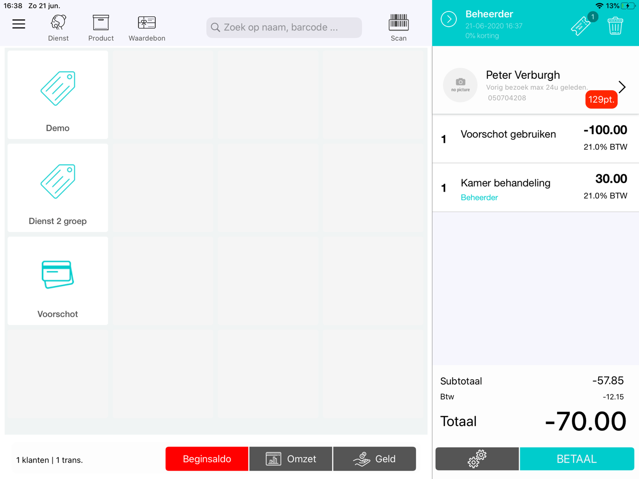 Hierboven zie je dus dat de totale kassabon nu op -70 EUR uitkomt.