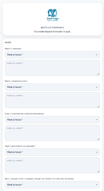 Een digitaal formulier kunt u opmaken aan de hand van de info die in de standaardformulieren of zelf opgemaakte formulieren staan (info opmaakklantformulier: https://posworld.freshdesk.com/support/solutions/articles/44002263264-opmaken-klantenformulier-naar-wens)
