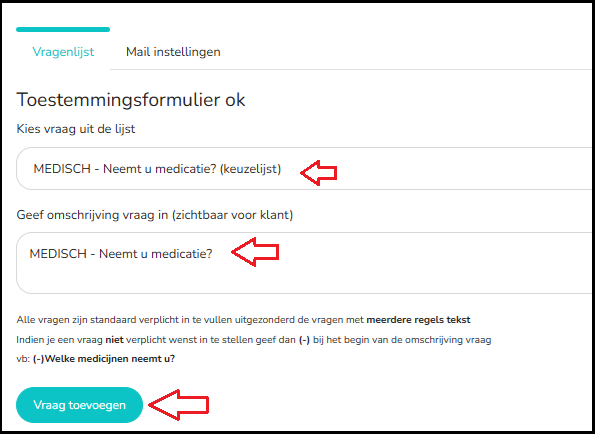 Kies nu een vraag uit de lijst (dit zijn de vragen die in het standaardformulier staan)