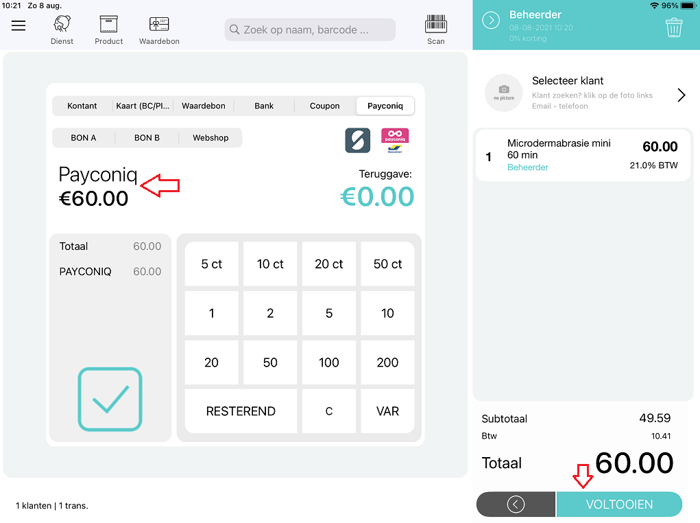 Nu wordt het bedrag geregistreerd op betaalwijze "Payconiq en kan je de kassabon afsluiten.