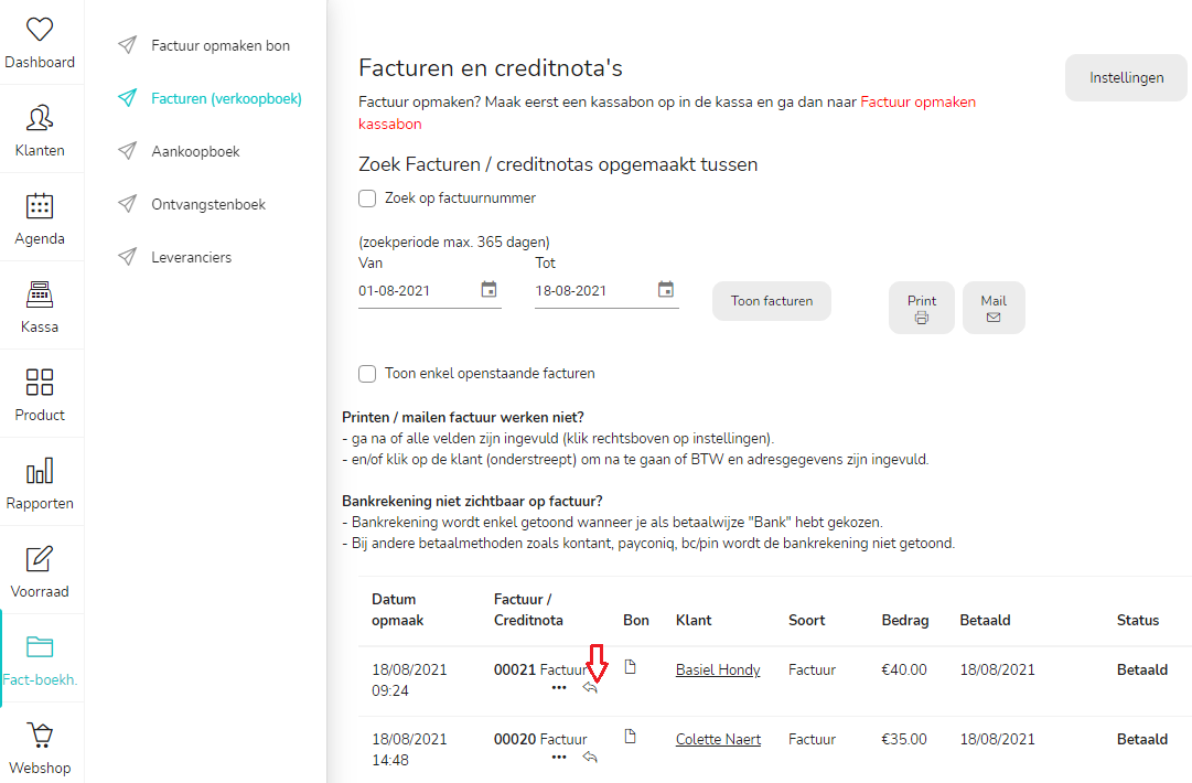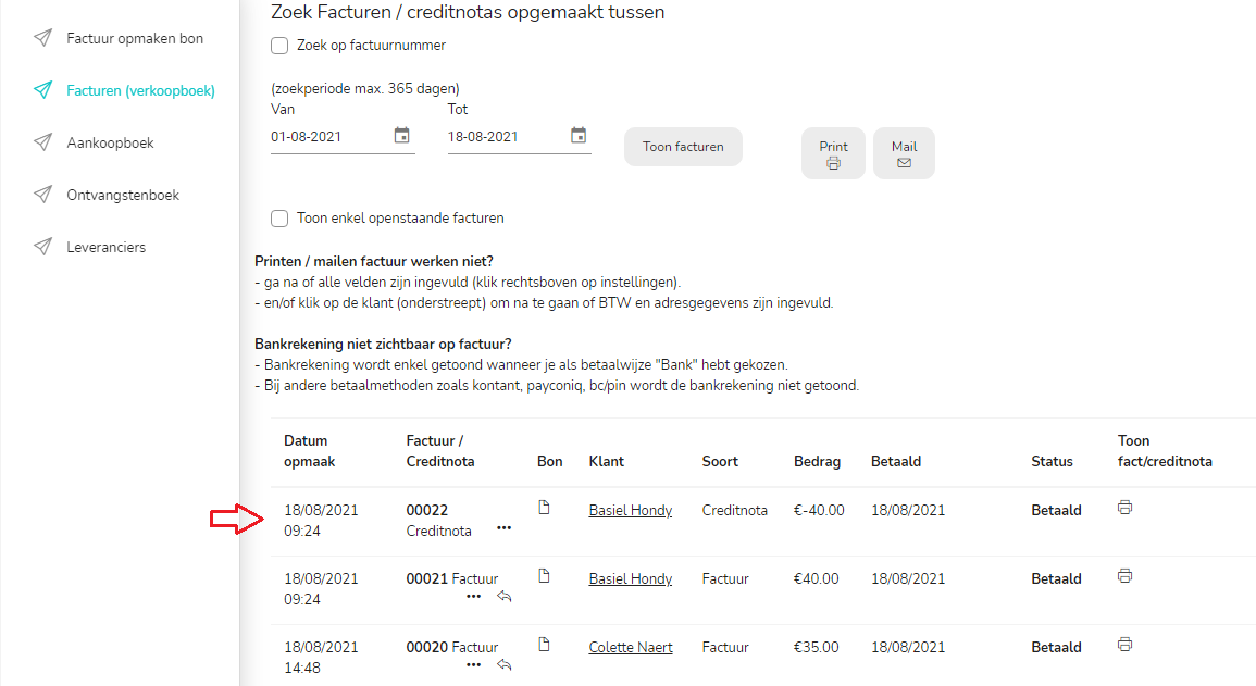 Hier zie je nu alle reeds opgemaakte facturen en/of creditnota's.