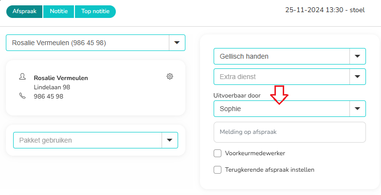 Klik in de agenda op gewenste dag/uur in de kolom van de RUIMTE en duidt aan welke medewerker dit mag uitvoeren.