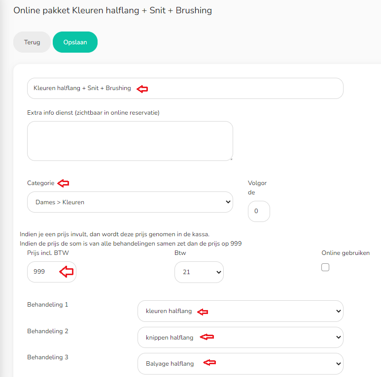 - we geven het pakket de naam 'Kleuren halflang + Snit + Brushing'