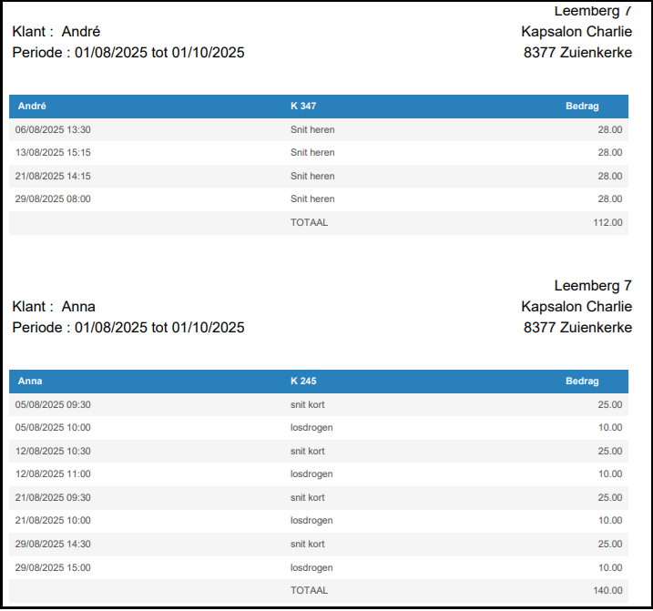 - volgende pagina's: detail per klant: datum, behandeling, bedragen.