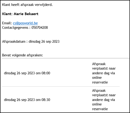 Wanneer een klant een afspraak wilt verwijderen of verplaatsen kan dit via de bevestigingsmail die hij heeft ontvangen waar de link staat [MIJNAFSPRAKENLINK]