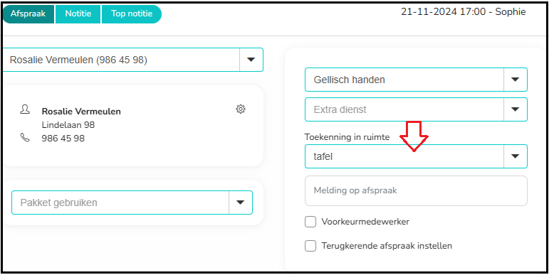 Klik bij de medewerker waar je deze afspraak wilt plaatsen + ken een ruimte toe.
