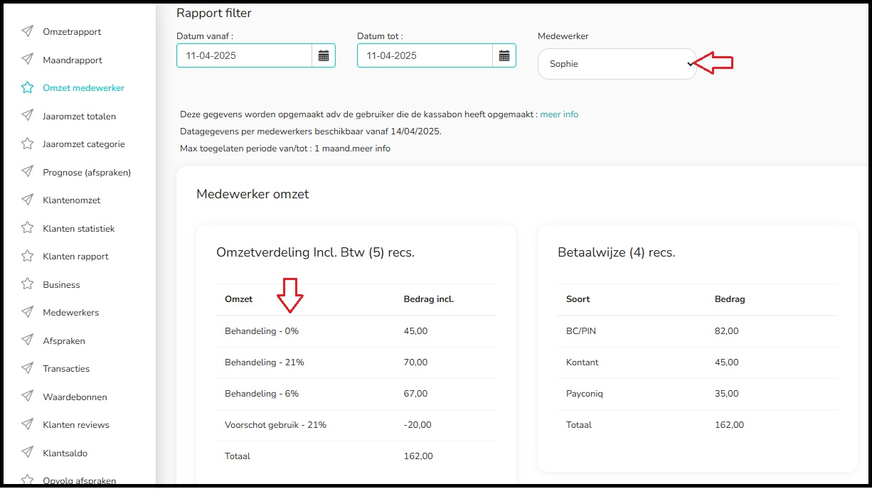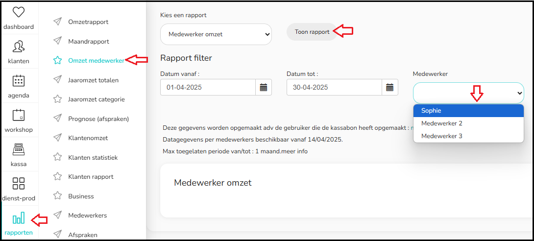 In dit specifiek rapport kan je de de omzet per medewerker raadplegen. Dit kan interessant zijn voor salons die met zelfstandige medewerkers werken.