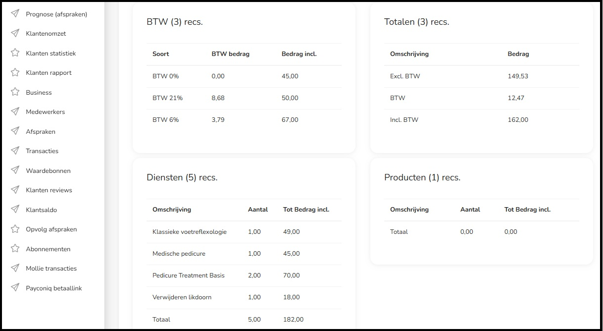 Je ziet mooi de opsplitsing van de betaalwijze alsook van de verschillende BTW stelsels.