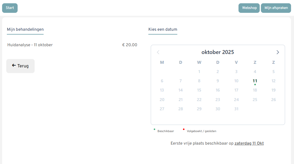 Wanneer de klant online deze wilt inboeken dan zal enkel op desbetreffende dag (in voorbeeld 11 okt) mogelijk zijn om in te boeken.