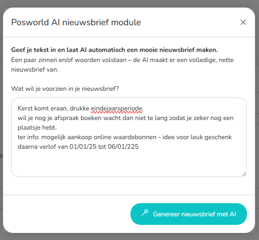 Heb je geen inspiratie om mooie teksten te schrijven? Maak dan gebruik van de AI assistent die ingebouwd zit in deze module. Zo kan je heel snel in enkele ogenblikken mooie en professionele brieven versturen.