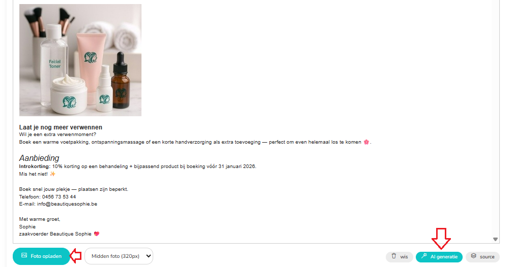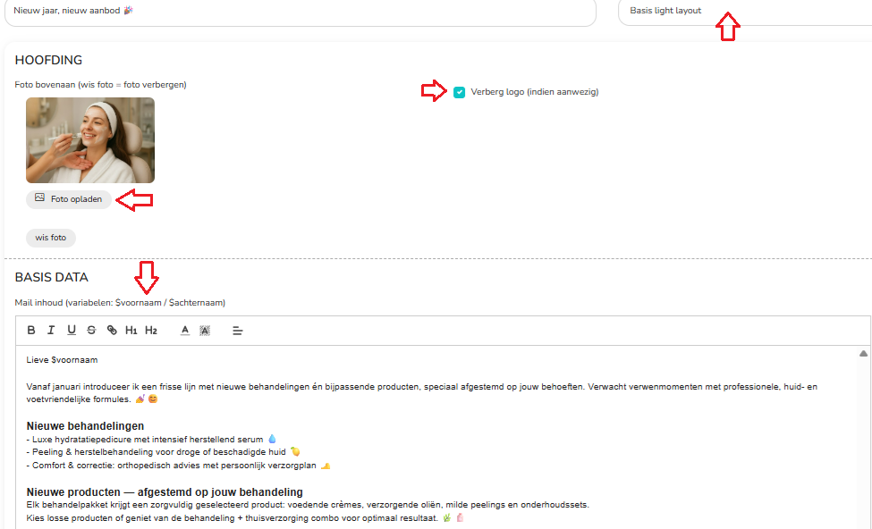 - Kies om logo wel of niet te tonen (wanneer je wel laat tonen dan komt deze bovenaan de mail, boven de foto)