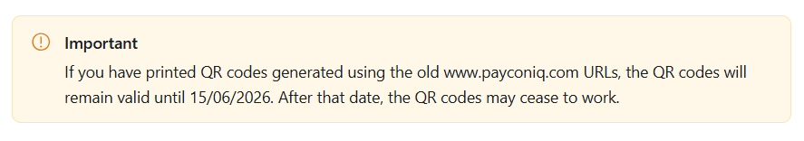 Als je QR-codes hebt afgedrukt die zijn gegenereerd met de oude www.payconiq.com-URL’s, blijven deze QR-codes geldig tot 15/06/2026. Na die datum werken de QR-codes mogelijk niet meer.